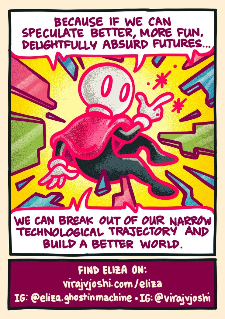 Why do our visions of the future all look the same, bleak, and inevitable? Join Eliza in going beyond these narrowing futures into larger possibilities - solarpunk worlds, human-machine harmony, and alternative arrangements of the internet.
