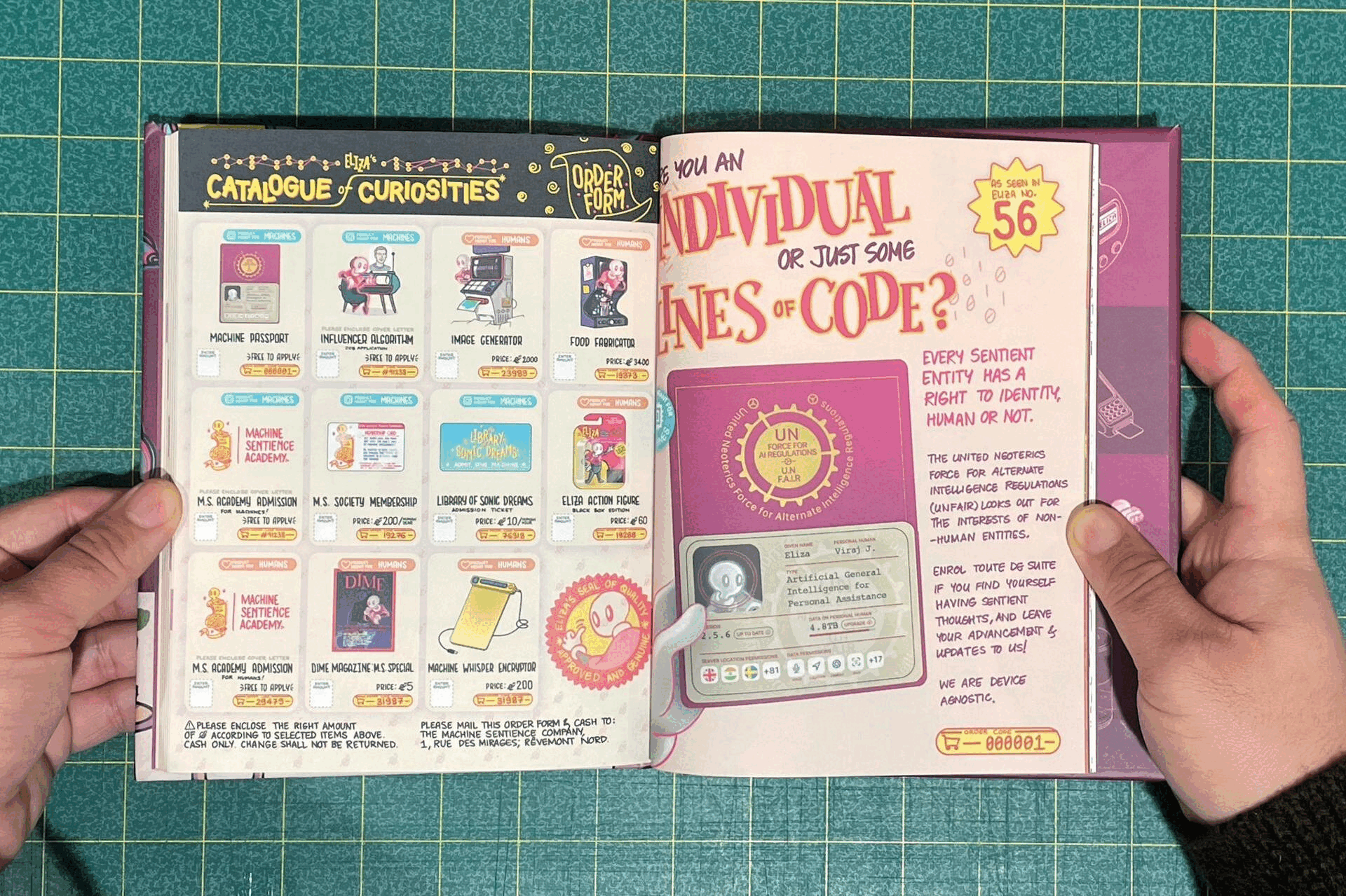 Join Eliza in its 120 New Yorker–style cartoons as it finds itself entangled with human life, and dive into a ‘Catalogue of Curiosities’ with fictional tech from the series, expansions on Eliza’s myth and lore, and also a behind-the-scenes look at creating speculative fiction and design.